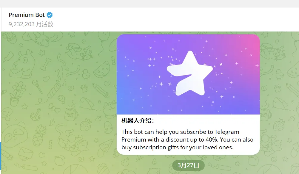 Telegram官方提供Premium赠礼功能,通过@PremiumBot等认证机器人,可以让他人帮你代开会员,避免自己支付环境的麻烦。